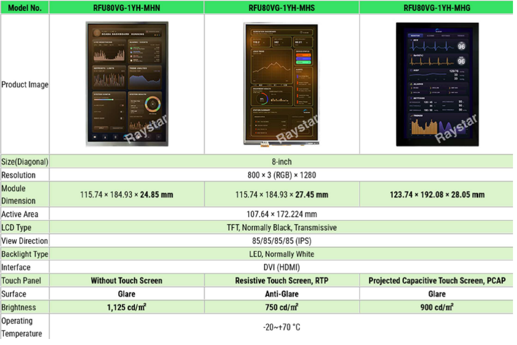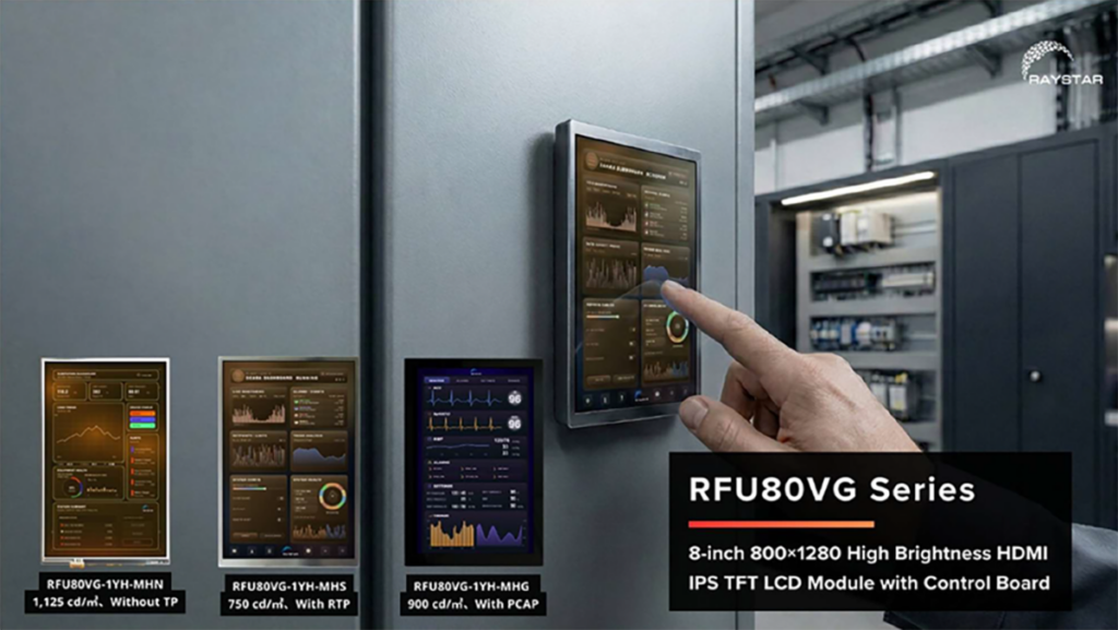 La serie RFU80VG di RAYSTAR è composta da moduli LCD TFT IPS da 8 pollici con interfaccia HDMI e risoluzione di 800 × 1280, che integrano il pannello display e la scheda di controllo in una soluzione compatta. Progettata per applicazioni che richiedono elevata qualità di visualizzazione ed efficiente integrazione di sistema, questa serie supporta l’ingresso HDMI con conversione in uscita MIPI DSI.